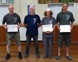 < Twenty-year plus students, Ian Draycott, Lynda Lee and Elton ‘PJ’ Whiting receiving a step-up Master Grade Award/Licence; 2023.